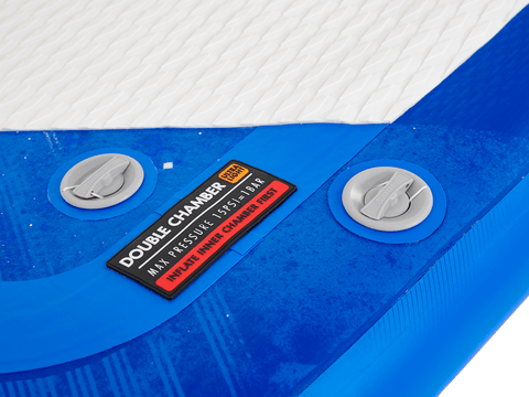 It starts with double chamber technology. Two mid-board inflator valves fill two separate chambers of equal volume – one inner and one outer – providing outstanding safety and stability benefits. If one chamber should leak, you’ll still have at least 100 liters of safety buoyancy in the other, so you’ll be able to paddle to shore for repairs instead of having to swim for it and possibly losing your board. Rigidity is another irresistible dual-chamber advantage. The two chambers offer a much stiffer surface than single chambers, which can feel soft and bouncy. Extra air pillars inside the inner chamber increase that stiffness by 30%. Tightly bound by a durable drop-stitch exterior, this board can convince even its bigger riders that they’re on a hard board – until they lift it out of the water and discover how lightweight it is.