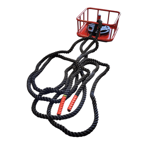 The MD Buddy Anchor Station is a great solution for wrapping and storing battle ropes. The basket itself is heavy and weighs over 45 LB but it also has an Olympic weight plate peg in the middle for extra anchor power. The vertical and horizontal rungs give many options for wrapping the rope for up to 12 different ropes simultaneously. A rubber mat on the bottom of the anchor stabilizes it and prevents both slipping and marking on the floor.