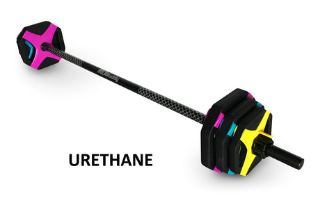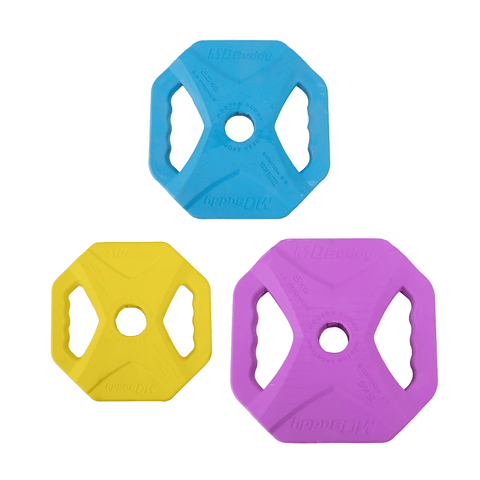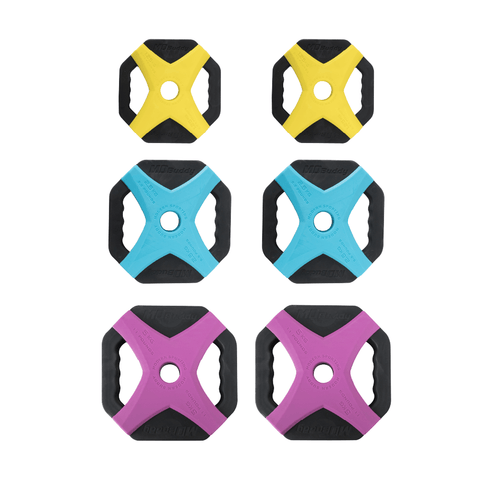 These barbell grip plates are encased in urethane or rubber that’s impact resistant and will protect floors from damage. The bars are lightweight which makes it easy to progress with additional plates and a quick-release locking collar. Set includes bar, collars and plates.