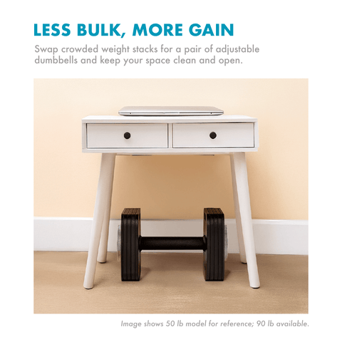 Massive Range in One Pair – Adjust from 10 to 90 lbs per dumbbell in secure 5 lb increments.