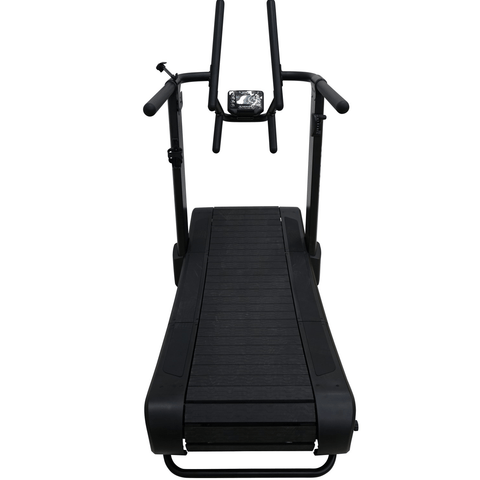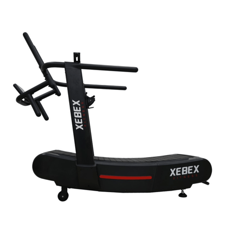 The Xebex AirPlus Runner Smart Connect is a non-motorized, self-generated, curved treadmill. It uses no electricity and instead runs on the energy produced by the runner's own movement on the treadmill. Beginners and competitors can run at desired speed and change output at will with no maximum or minimum speed setting. Further, the AirPlus lever allows users to adjust the resistance from level 1 up to level 8 for added resistance. Use our multi-grip handlebar to mimic sled drives in various handle grip options.